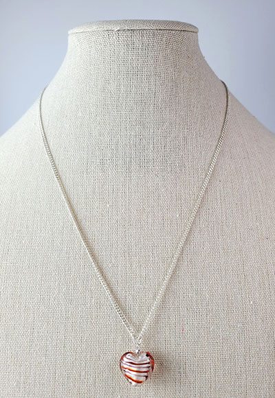 Collier composé d'un pendentif en forme de coeur tapissé de feuilles d'argent fabriqué par un artisan verrier et d'une chaîne plaquée argent maille gourmette. Ce collier est un bijou d'amour, le pendentif coeur comporte des stries rouge passion toutefois discrètes. Un cadeau idéal pour un être cher. Longueur de la chaîne : environ 50cm. Photo non contractuelle, la fabrication artisanale de ce bijou en fait un bijou unique.